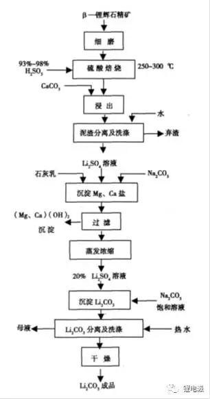 硫酸法工藝在工業生產上常用,鋰礦經過磨細-焙燒-浸出后,加入硫酸鹽除雜過濾,得到硫酸鋰溶液。利用該溶液制備沉淀的碳酸鋰后洗滌干燥獲得產品。該方法產率較高,且對鋰礦品位要求不高。硫酸法工藝也同樣可以處理鋰云母。