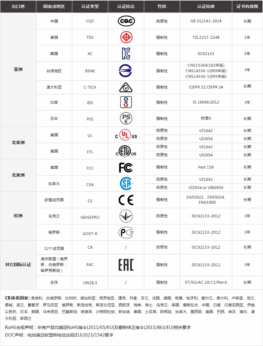 全球主要國家和地區(qū)認(rèn)證明細(xì)(電池產(chǎn)品類)